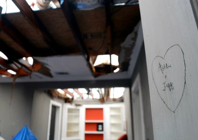 I began searching the crowd of people for my husband. I soon discovered that not only had my house been “hit,” my husband was pulling a superman out helping people, leaving me at the church to receive this news alone. I had a thirty-second moment of panic because though I am not an overly emotional girl, I knew how much money sat in my bank account (shout out to all those struggling newlyweds). I quickly pulled myself together when I thought of Pam Beasley (the dog, not the human). Pam Beasley is my first child, and though I am aware she is a dog, she becomes highly offended if one suggests that she is any less human than the rest of us. There was some walking in the rain (in a pencil skirt, tights, and leather Gianni Bini boots-No big deal) involved in reaching my actual street. As I rounded the corner, I saw my roof perched upside down on my front lawn. People swarmed my property like ants surrounding a freshly stomped anthill. I found my husband who confirmed that Pam Beasley is a survivor and was in his truck unharmed but with a large host of doggy PTSD symptoms. A man I did not know handed me a black garbage bag and instructed me to pack up any clothes that I could find. Sunday was laundry day, and the laundry room was gone. It did not have some damage. It had ceased to exist. As I made my way to step through the threshold into the laundry room, I was looking at my backyard and a huge drop off to the wet soil that used to be under my laundry room. After kicking broken contents of my life out of my way to reach the master bedroom, I began pulling clothes from dresser drawers and closets and stuffing the bag. Another man I did not know was kind enough to help me hold the garbage bag as I emptied my lingerie drawer and other personal items from my bedroom. Friends, all pride and privacy ceases to exist when the place you live starts to look more like an opened can than a house. As I walked away from my house that night with the clothes on my back soaking wet and my anxiety ridden Boston terrier in my arms, I did not feel stress or worry. I was full of faith and assurance that my God was big enough to create beautiful things out of even the most chaotic life circumstances. I continued to grow more at peace and thankful in the following days as friends offered a place to live, food to eat, and donations to help my husband and me piece our lives back together.